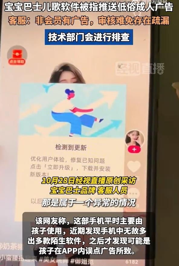 据经视直播报道,近日有网友反映,打开宝宝巴士旗下一款“宝宝巴士儿歌”APP时,开屏会跳转到含有成人内容、低俗擦边直播等不适合儿童观看的第三方广告。10月28日,宝宝巴士品牌客服表示,非会员状态下APP内确实会展示由第三方平台投放的广告,但平台会对广告内容进行审核监督。审核过程中难免存在疏漏,如出现低俗等不适宜的广告,属于“异常情况”,将反馈处理。